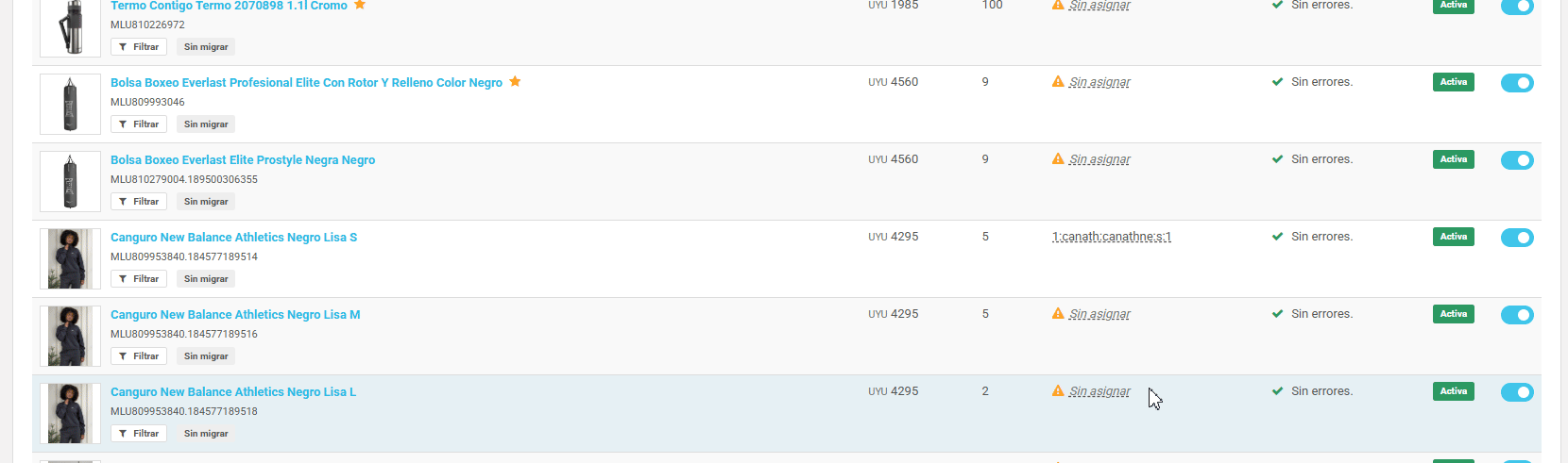 En las publicaciones sin migrar, si una variante de un artículo figura con stock 0 y se muestra como activa, esto se debe a que la publicación padre sigue activa y/o porque otras variantes del mismo producto aún tienen stock disponible.