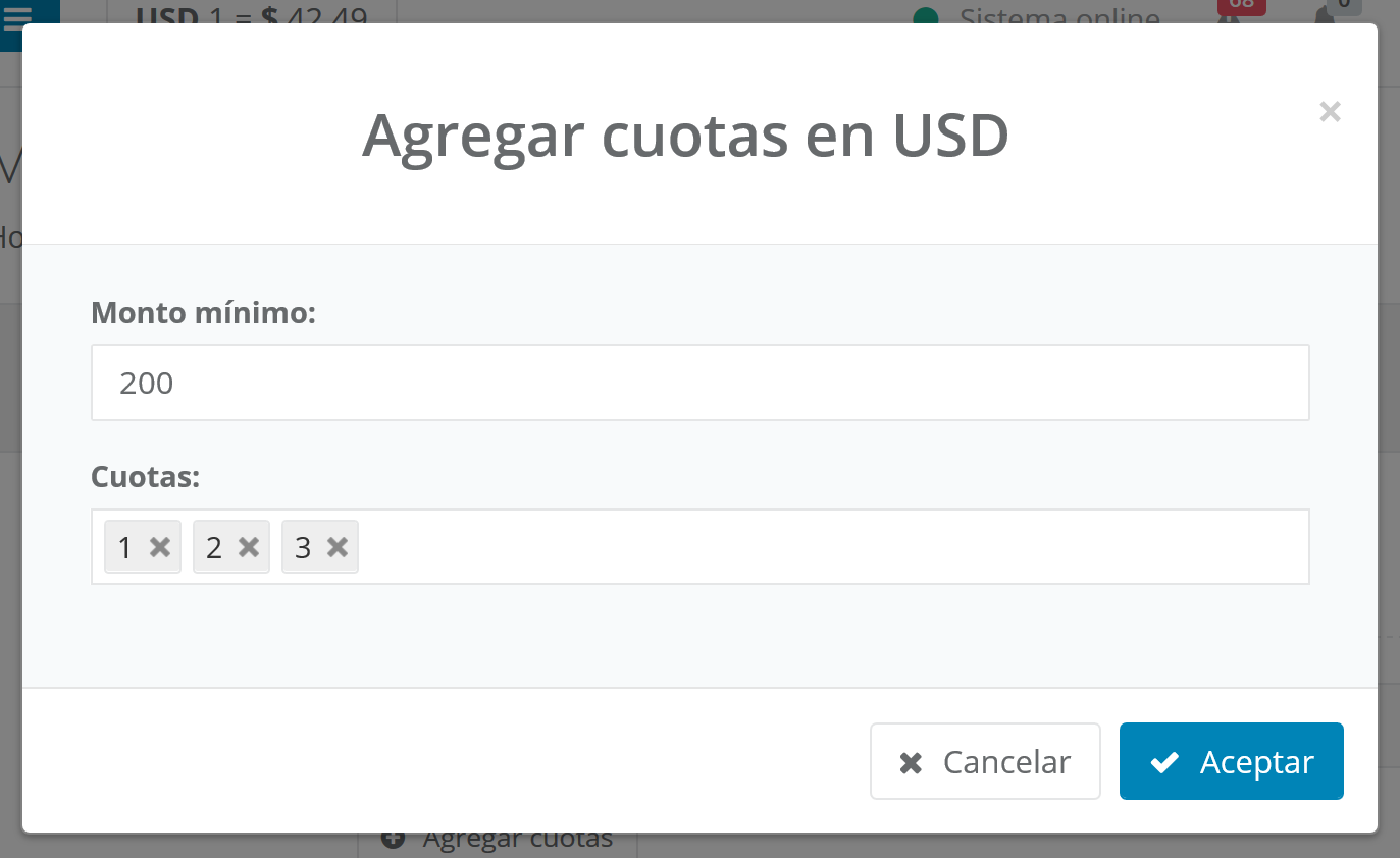 En el campo de monto mínimo se debe ingresar el monto mínimo que debe alcanzar la compra (en la moneda seleccionada) para que se le ofrezcan al comprador las opciones de cuotas indicadas en el campo cuotas. Si se desea que las opciones de cuotas estén disponibles para todas las compras, el monto mínimo debe ser 0 (cero).